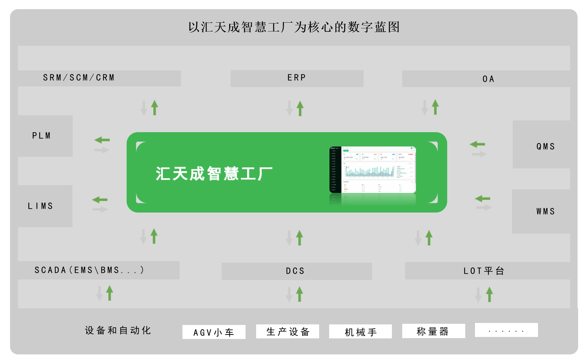 以汇天成智慧工厂为核心的数字蓝图,从SRM/SCM/CRM/ERP/OA/QMS/WMS/LOT平台/DCS/SCADA/LIMS/PLM围绕智慧工厂拓展,为企业统一数据管理,打通数据孤岛!