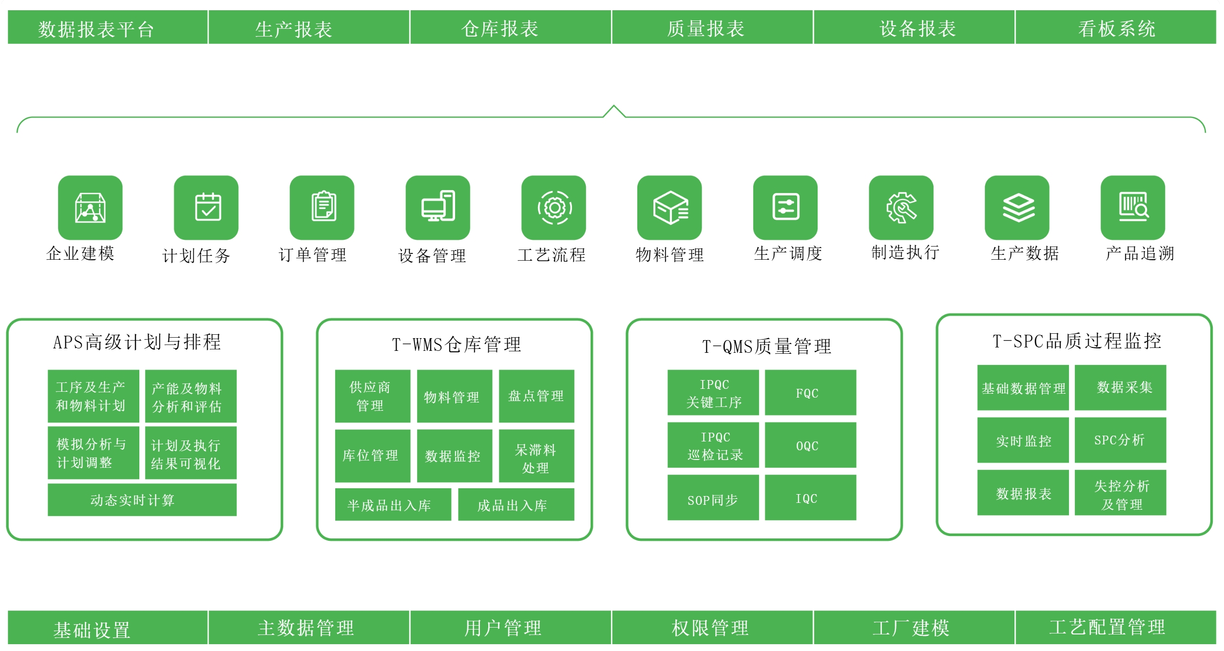 智慧工厂现场执行管理流程包含四大块,从APS高级计划与排程、T-WMS仓库管理、T-QMS质量管理、T-SPC品质过程监控进行管控,企业建模、计划任务、订单管理、设备管理、工艺流程、物料管理、生产调度、制造执行、生产数据、产品追溯。