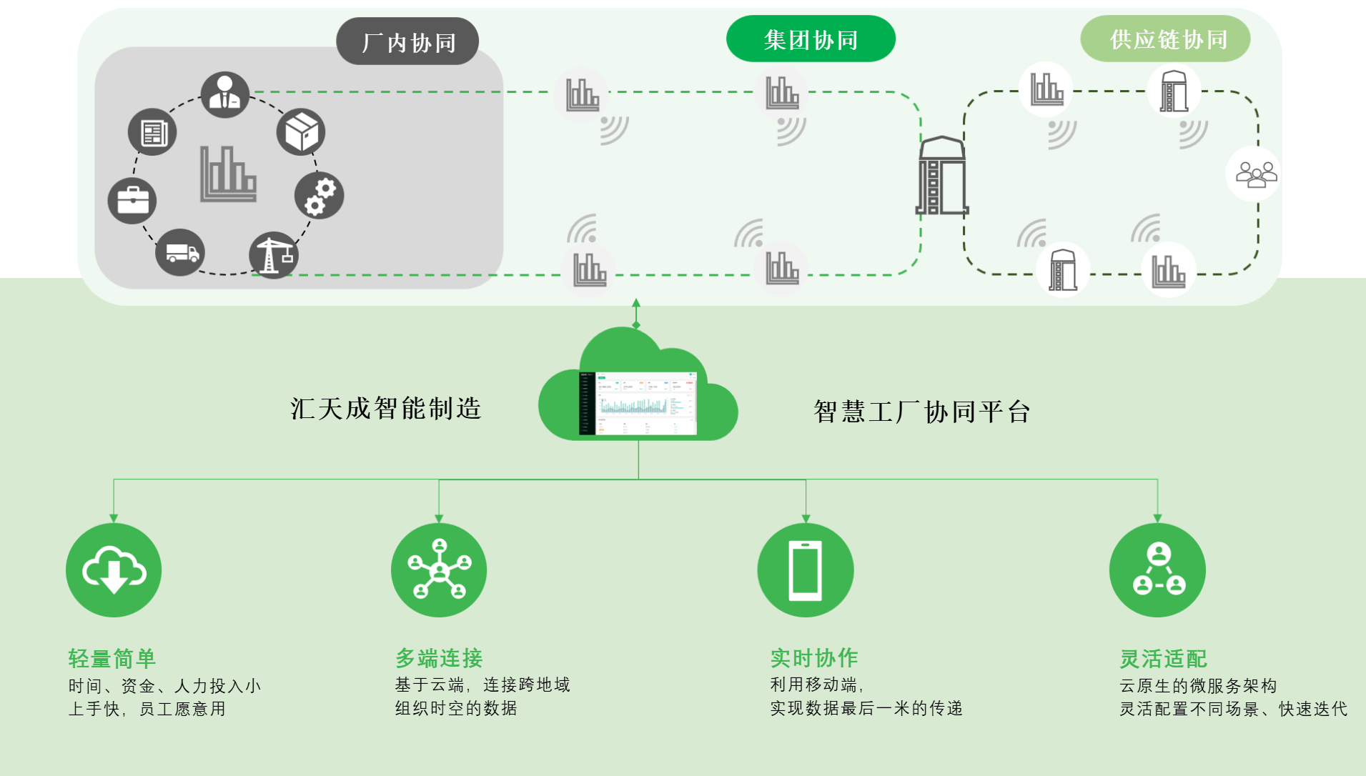 汇天成智能制造智慧工厂协同平台,针对企业厂内协同、集团协同、供应链协同,使企业轻量简单、多端链接、实时协作、灵活适配;