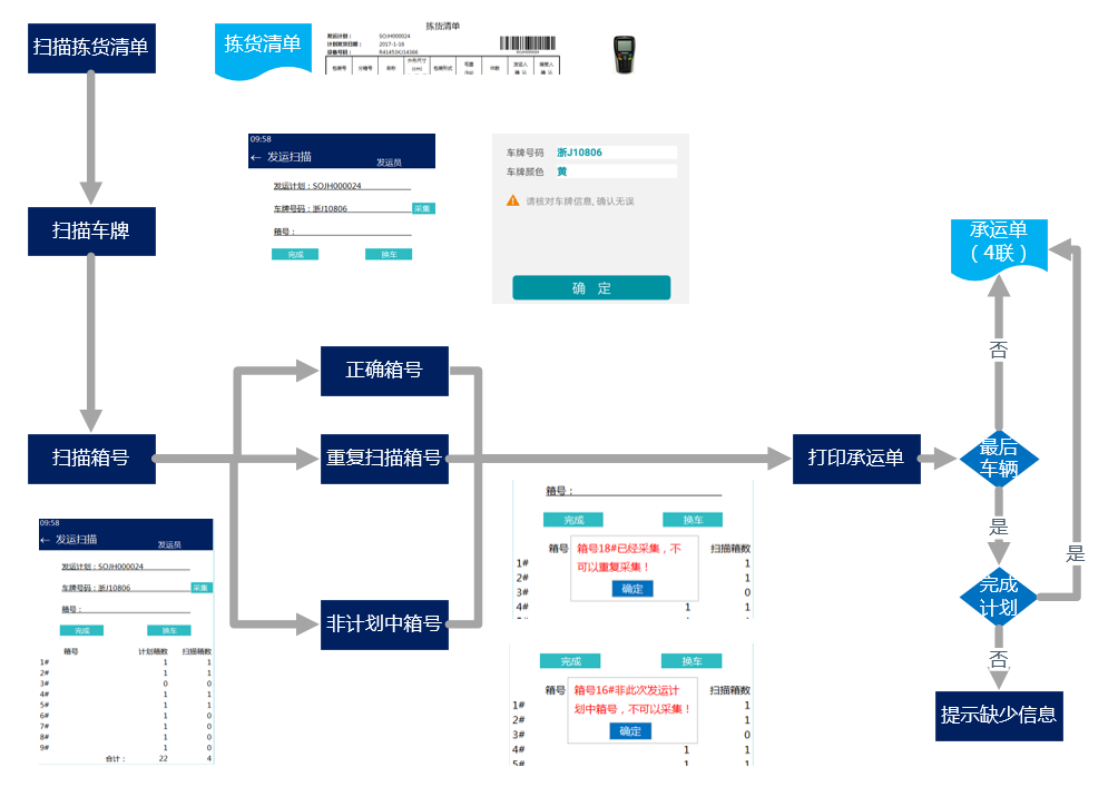 拣货清单:以出货计划打印每次预定出货信息;                             发运采集:扫描实际出货箱号信息同时匹配相应出货计划;