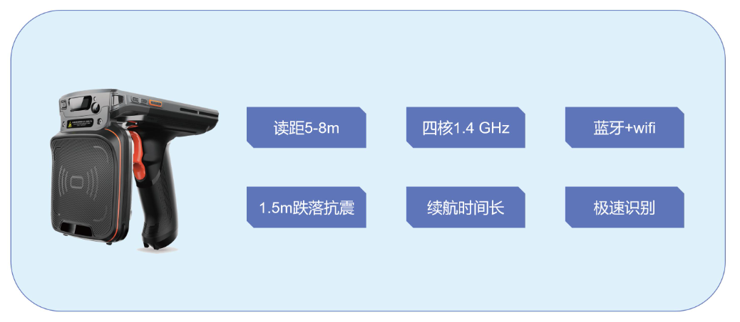 1、阅读器:本系统采用超高频阅读器,分别为固定安装阅读器和手持式超高频RFID阅读器,阅读器通过天线感应标签,并读取标签内的数据信息。固定安装阅读器对标签读取的距离可以达到八米以内,而手持式阅读器的读取距离为1米左右。